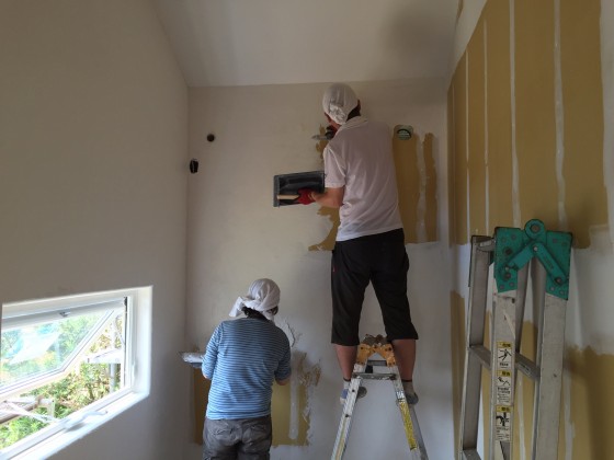 前回のペンキ塗りに引き続き 2日目の漆喰塗りは初日とはうって変わってかなりのスピード・アップ。こちらがペースダウンをお願いするほど。たぶん私の工程に気を使い、仕上がりをかなり妥協してくれたのではないでしょうか?こんな気遣いをとても嬉しく思います。だけど工程の心配はいらないので漆喰塗りをじっくり楽しんでください!