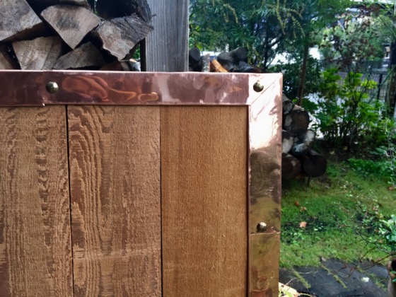 看板の試作品。裏と表で板の張り方を変えてみました。まわりを銅板で囲み経年変化で変わる板のシルバーグレー色と銅板の緑青のコントラストを楽しみます。
