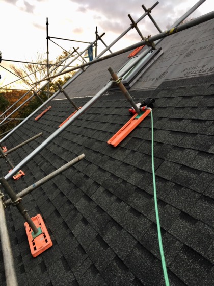 急勾配の屋根工事を始めました。体全体を使っての作業なので、体のストレッチをしているかのようです。