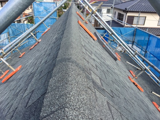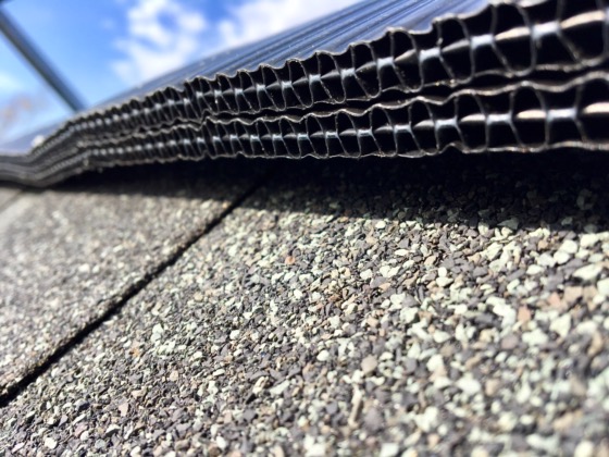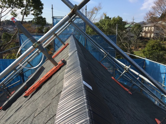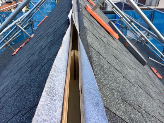 大胆に屋根の一番上に空気を抜く穴を開けました。夏に暑くなり過ぎる屋根裏部屋の為には欠かせない屋根の棟換気工法です。