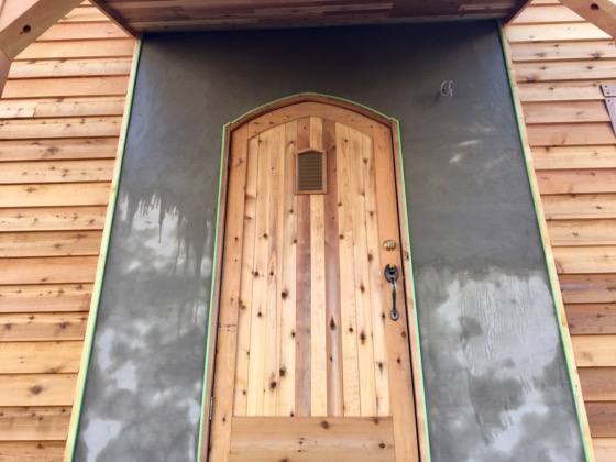 玄関周りは漆喰仕上げ。漆喰仕上げは下地処理に時間がかかります。