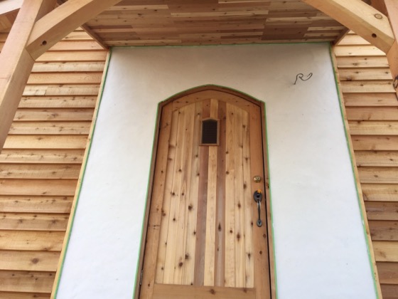 玄関周りは漆喰仕上げ。玄関ドアが浮き上がりました。