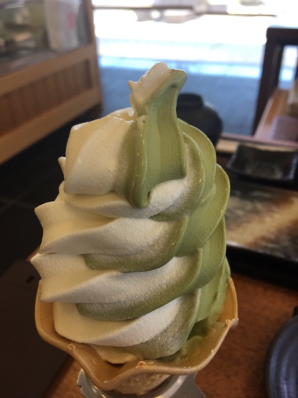 大好きなゆばの天婦羅御膳。そして豆乳ソフトクリーム。癒しのひと時を久しぶりに。。。抹茶とバニラの豆乳ソフトはいつもの1.5倍。サービスしていただきました!