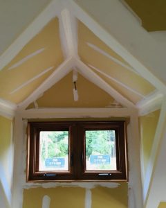 ドライウォール工法と漆喰仕上げ材。ドライウォール工法で密閉力をたかめ、冷暖房の費用を抑えて、漆喰の仕上げ材を使って室内の調湿効果をたかめます。地球にも人々にもやさしい家づくりだと思っています。