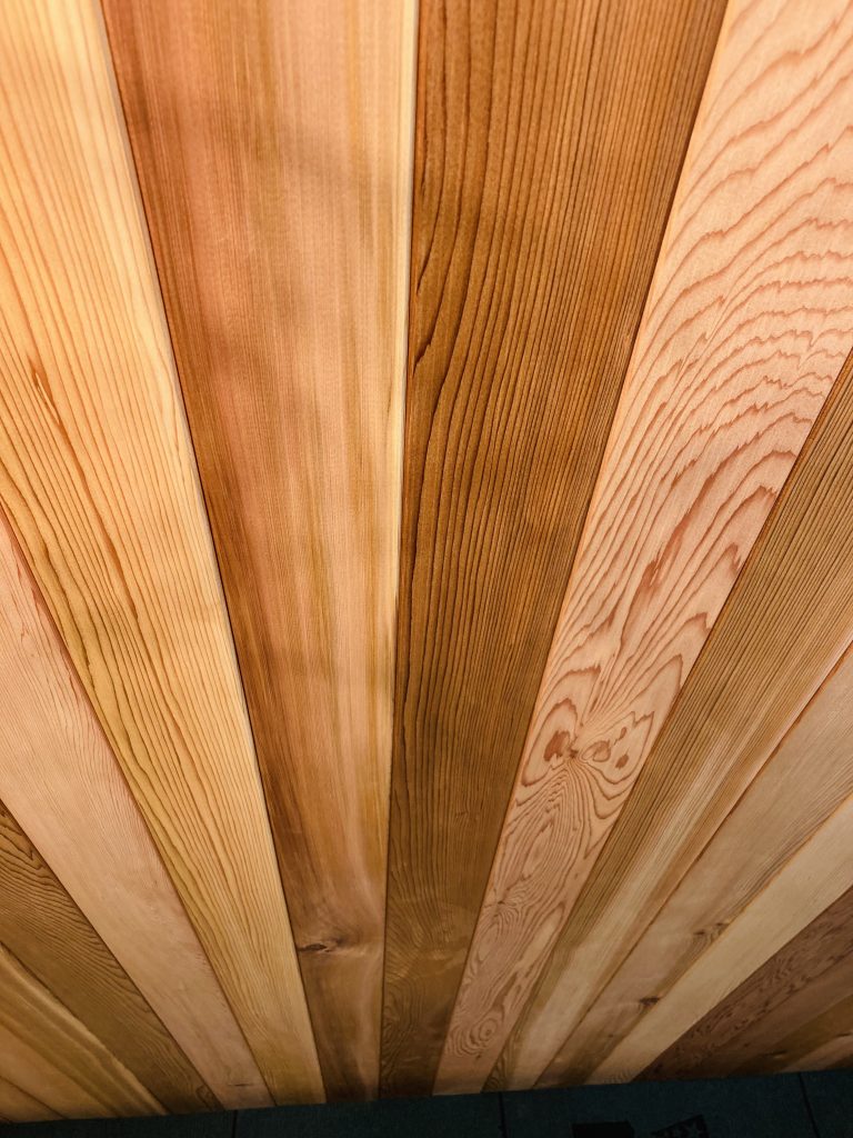 最近はあまり見られないユニットバスではない浴室。経年劣化の為にリホームです。今回はハーフユニットバスを使用します。床はユニットバス、天井と壁はレッドシダー材の天然素材仕上げです。